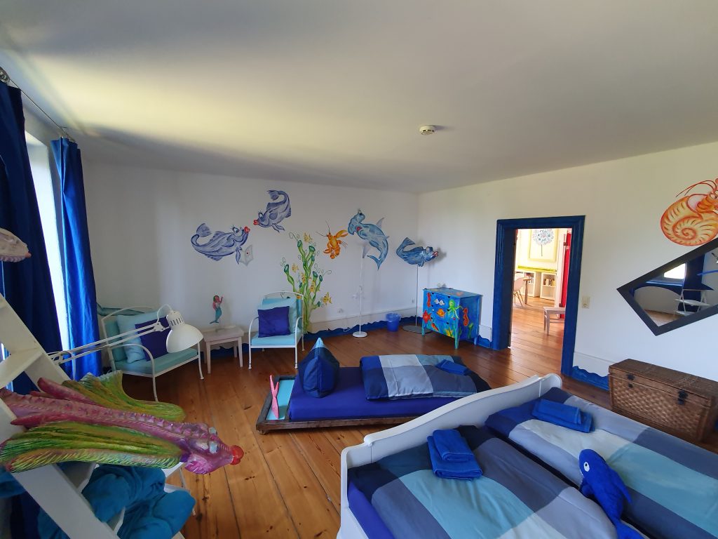 Lebendig, frรถhlich und groรzรผgig. Zwei Etagenbetten und ein franzรถsisches Bett machen es zum idealen Familiennest.